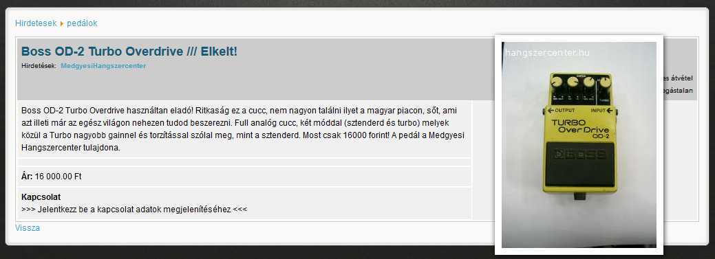A lényeg, hogy mivel ezek nem túl drága dolgok, így nem volt nagy kockázat egy esetleges vételben. Elkezdtem figyelgetni a neten, hogy mikor bukkan fel egy használt példány, de több hónapon keresztül nem nagyon akadt semmi horogra. Aztán egy teljesen elfeledett hirdetésre írt e-mail-emre érkezett válasz, mégpedig egyenesen a Medgyesi Hangszercenterből, hogy van náluk egy ütött-kopott példány már jó régóta. Na mondom, ez lesz az, próbáljuk ki. Mivel sokszor jártam már ott korábban, így az eladókat nagyjából már ismertem, egy-két alkalommal a Nagyfőnökkel is sikerült szót váltanom. Ez persze nem sokmindent befolyásolt a pedált illetően, megegyeztem velük telefonon, hogy elpostázzák. 16 eFt plusz posta nem egy nagy kaland, de a kedvenc ME-8 hangja ha visszajönne full analógban, akkor az ennél sokkal többet is megérne.