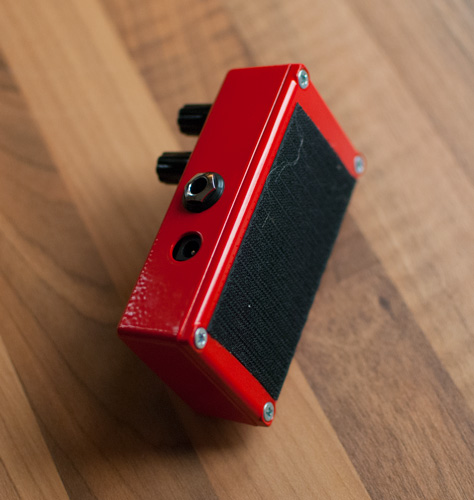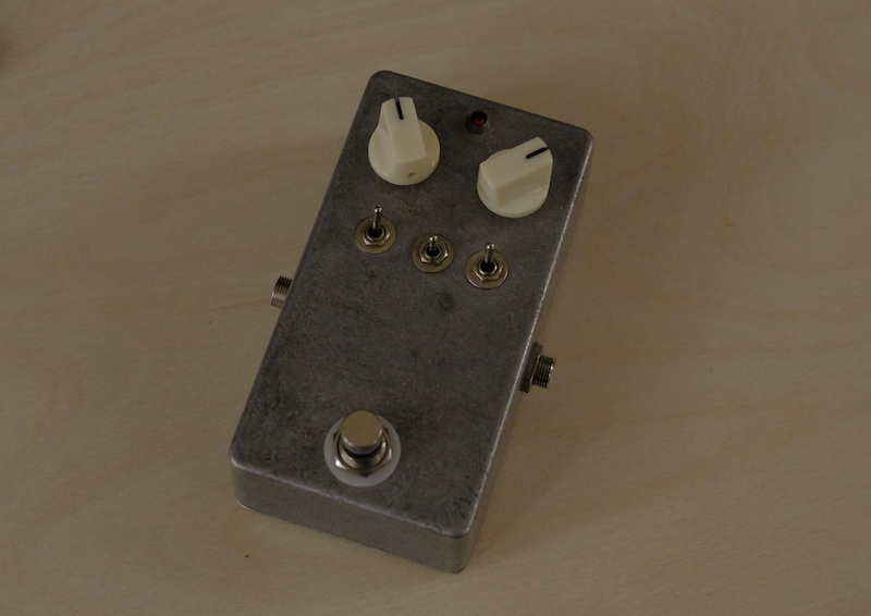 Nagyon örülök, hogy megcsinálta Csaba ezt a pedált nekem, mert egy kiváló kis eszköz lett belőle, ami sokszorosan túlszárnyalja az eredeti képességeit, és nem mellékesen ez az egy van belőle a világon :). Az ára postázással együtt volt 13.000 ft, ami nevetséges ár egy ilyen jó cuccért, de egyrészt már félig kész volt (nem kellett neki mindent nulláról kezdeni), másrészt pedig gondolom ő is népszerűsödni akar, így mindketten jól jártunk ezzel az üzlettel. A lényeg, hogy az egyedi kéréseimnek megfelelően kibővítette az eredeti DOD 250-es tudását egy pár ponton. Ezek a következők: került bele állapotjelző led, Boss-szabványú lett a tápcsatlakozó, a kikapcsolt állapotú buffere válaszhatóan true-bypass vagy bufferelt (jobb oldali kapcsoló), balra került bele egy bright kapcsoló, ami alacsony gain állásoknál jön kifejezetten jól (a DOD 250-nél jellemzően egyre több a magas, ahogy nő a gain), és került bele még egy háromállású kapcsoló (középső), amivel a vágódiódákat lehet állítani. Az eredetiben Si vágódiódák mennek a földre, ezeket lehet egy kicsit felturbózni: felső állásban a két Si-dióda, alsó állásban Si+LED csinálja a vágást, középső állásban pedig kiiktatásra kerülnek a diódák, és helyettük az IC limitál. Ebben az esetben még jobban számít persze, hogy milyen IC kerül a pedálba, de ezt sem bíztuk a véletlenre: biztos ami biztos alapon a jól bevált 1458-as került bele. Ez az vágódiódák nélküli állás talán a legjobb az összes közül, annyira direkt, és annyira sok benne az ízes felharmonikus. Itt érdemben az ember nem is torzítást hall, hanem ahogy elkezd a hang a felharmonikusokban túltelítődni.
