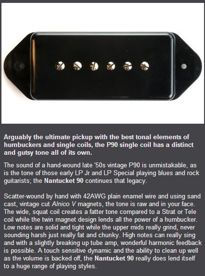 Visszatérve a hangszerre, 2014 márciusában 'teljes véletlenségből' jártunk a StageShop-ban Ádámmal, és felajánlott nekem az egyik eladó egy Bare Knuckle P90-es hangszedő szettet kipróbálásra. Azt mondta, hogy 50 rongy, de ha nem tetszik, akkor vigyem vissza, aztán visszaadják a pénzt. Hát mondom oké, mi bajunk lehet, így aztán megkötöttük az üzletet, hazavittem a hangszedőket. Az új pickup-okról nem sokat tudtam, de sikerült a gyártó honlapján szert tenni némi infóra: BKP Nantucket P90 kalibrált szett, a tradícionális és a modern hangzás között félúton, közepes jelű single coil hangszedők (legalábbis ezt mondták, de szerintem nem azok...). A nyaki és híd felőli Wilkinson-ok kerültek kicserélésre, a középső maradt az eredeti. Az eddigi tapasztalataim alapján már nem is dobtam akkora hátast, szinte elvárás volt, hogy bitangul szóljon. Ez körülbelül be is jött, sokkal érthetőbb, tisztább, feszesebb hangképű P90-ek ezek, a nyaknál eléggé ugyanolyan színezettel, mint a gyári Wilkinson, csak sokkal részletgazdagabban, és talán zajmentesebben. Ami talán váratlanul ért, hogy a hangok lecsengése sokkal egyenletesebb, és hosszabb lett. A híd felőli hangszedőt viszont egy kicsit vékonynak éreztem, kevesebb teste volt, bár egy rendesen kihajtott csöves erősítőnél ez előny is lehet. Ettől függetlenül az első gondolatom az volt, hogy inkább középső állásba való.