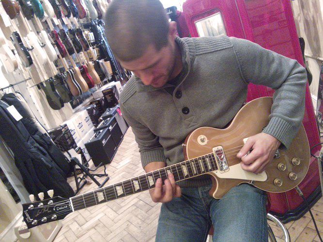 Visszatérve a gitár megvásárlásának történetéhez, az első próba még valamikor 2013. január elején, a Nyugati téri Eldorádóban (az Alexandra könyvesbolt aljában - Kösz Ádám, hogy elvittél oda!) történt, pusztán viccből, csak azért mert P90-es hangszedők voltak benne. (Na! Ez meg az újabb tőrdöfés! :)) Ádámnak effekteket keresgélve lyukadtunk ki az Eldorádóban, és próbálgattunk mindenféle hangszereket, amik a falon lógtak: amerikai meg mindenféle Telecastert, Stratocastert, japán Epiphone Elitist-et, sőt Usa vintage GibzonLezPólt (600e, jó mondjuk ez ott volt azért a szeren, csak hát jobbos volt...) is, de egyik sem fogott meg túlzottan. DE EZ! Uhh, egy az egyben az az érzés, mint amikor hirtelen felindulásból megvettem a Sheraton-t. Azt sem tudtam megindokolni, mégis a mai napig a világ hangszere. Most meg ez, tessék. Pedig új, jobbkezes, formagitár, és P90-es.