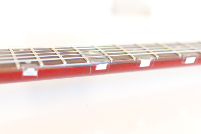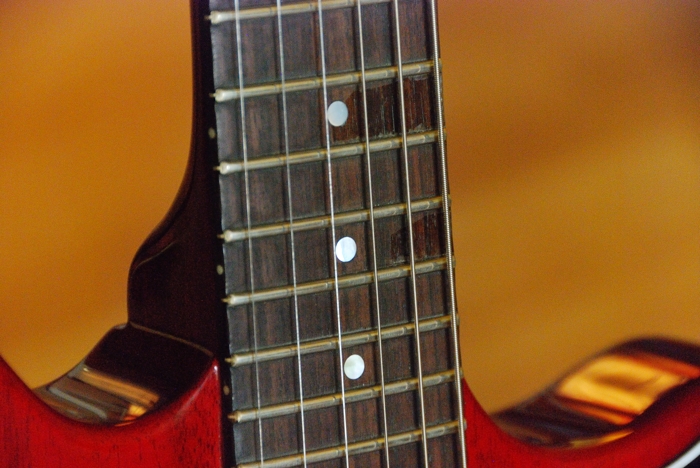 És ami a legfontosabb, hogy kézbe véve kifejezetten jó hangja van már akusztikusan is. Nálam az első próba mindig akusztikusan történik, mert ha úgy nem inspirál a hangja, akkor az elektronika csak legfeljebb elrejti a hibákat, meg nem szünteti. És ez a hangszer jól szólt: szépen, hosszan, és részletgazdagon, ami jó alap ahhoz, hogy elektromosan is szép tiszta hangot kapjunk. Ebben nagy segítség a három részből összeállított tiszta mahagóni test, és az alapból jól beállított, 25"-os (!) mahagóni nyak, valamint az indiai rózsafa fogólap, ami olyan sötét erezetű, hogy több netes forrás már az ébenhez hasonlítja. A recept különösebben nem korszakalkotó, a Gibson jópár gitárja (SG, Firebird) ugyanis kb. ugyanígy készül, sőt árulják őket ugyanígy P90-ekkel is, tehát részint bevált formulák mentén született a hangszer. A fogólapon fehér gyöngyház pötty-berakások vannak, amik minimalisták, de szépek. Őszintén szólva hiányolom a gitárról egy kicsit a díszítést, de meg lehetett szeretni így is :).
