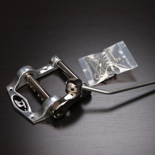 Tudtam már régebben is, csak nem szántam rá magam, hogy az Esprit (vagy kiérdemelt nevén Eszti) is kapjon egy tremolót. Igazából már jó egy éve nézegettem, hogy milyet kellene, de a balkezesség még jobban megnehezítette a dolgokat, mint korábban. A forint gyengülése miatt az USA-import balos Bigsby vámmal együtt majdnem egy százas (!) lett volna, az Ebay-en 200 Euró körül találtam egyetlen B5-öt Európában, de szállítással együtt ez is 75 eFt körül jött volna ki akkoriban. Nagyon sokalltam, de a hónapok alatt kénytelen voltam hozzászoktatni magam a gondolathoz, hogy ez bizony drága mulatság lesz. A 'legolcsóbb' megoldást választottam aztán 2015 szeptemberében, amikor is a StageShop-ban egyedi rendeléssel hozattam egy Duesenberg Diamond Deluxe tremolót, annak is a rövid változatát, 58.000 Ft-ért. A felszerelés az új Elixir húrkészlettel együtt további 13 eFt-ot kóstált, de ez már a Vintage'52-ben történt, továbbra is Csambalik Tivadar vezénylete alatt. Szerencsére sikerült nekik úgy felapplikálni a szerkezetet a hangszer testére, hogy a korábbi Gotoh húrbefűző furatait 99%-ban eltakarja, így nem éktelenkednek a lyukak a gitár testén.