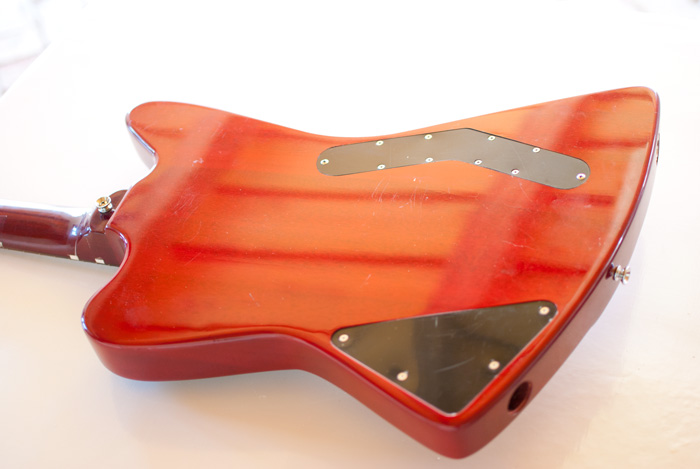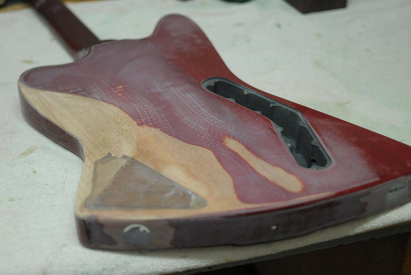 Ugyanis pontosan fél év alatt lett kész a hangszer, és még akkor is maradt rajta egy-két olyan apróbb javítanivaló, amit még később meg kell majd csinálni. De hogy a végeredményről beszéljek, az alábbi munkák kerültek elvégzésre ez alatt a hosszú idő alatt: Eltüntetésre kerültek a régi potméterek furatai, a régi jack aljzat és jobbkezes hevederakasztó helyei, a régi húrláb tőcsavarjainak helyei, földelésre került az új tremoló, feltöltötték fával és megszüntették a régi elektronika üregét, mindezt azért hogy ergonomikus hátsó kivágást csinálhassunk a mellkasnak (mint a sztratókon), a régi logót újra cseréltük (Estrit - erről is mesélek majd ;)), kibővítésre került az ötállású kapcsoló ürege, hogy kényelmesen elférjen benne a superswitch, az üreget pedig újra kifestették grafittal is az árnyékoláshoz. Ezen kívül eltüntetésre kerültek a jobbkezes pozíciójelölők a nyakon, mivel kapott a gitár egy nyaki binding-ot, amin csak a balkezes pöttyöket tettük már fel. Egyformára cseréltük az összes műanyag koptató- és takarólap csavarjait (Ez még a Halmai-örökség, hogy nem egyformák voltak), és végül, de nem utolsó sorban komplett újrabundozás (Jescar prémium), és komplett festés-lakkozás.
