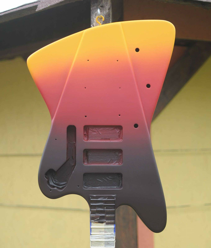 Az átalakítás nagy része rutinfeladatnak számított a GV-s srácoknak, de egy dologgal azért meggyűlt a bajuk, mégpedig a festéssel. Ezt sem ők, sem én nem gondoltam volna, de végül csak negyedikre sikerült olyan minőségben megvalósítani a háromtónusú színátmenetes festést, amire már mindenki azt mondta, hogy rendben. A problémát az okozta, hogy a testen van az az ék alakú szintkülönbség, ahol a beállított szemcseméret mellett a festék nem egyenletesen terített: vagy kihagyott, vagy megfolyt. A negyedik próbálkozás ettől függetlenül meggyőző lett, a színeket nagyon eltaláltuk, bár egy kicsit német zászlós, ha az ember úgy nézi :). Megérdemlik az ihletet adó hangszerek, hogy megemlítsem őket, mert két nem túlzottan ismert típusról van szó: az egyik a Novo Guitars Sectis Lake Como Blue festéssel, a másik pedig az ausztrál Maton Wedgtail, aminek volt egy hasonló színkombinációja.