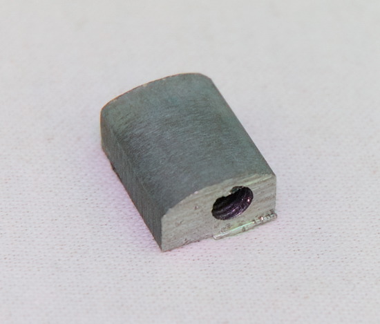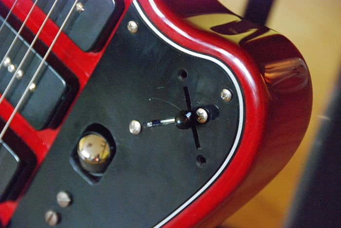 Az első utam - mondanom sem kell - a Vintage '52-be vezetett, ahol átfordították a nyerget balosra, kivették belőle a két potmétert, befúrtak egy új hevedertartót, és teljesen beállították. Nem maradt más, csak a három hangszedő és az ötállású kapcsoló. Így kezdtem el használni, de elég hamar kiderült, hogy legalább egy hangerő-potmétert valahogy vissza kéne applikálni a gitárba, mert az hiányzik. Hogy a fát ne kelljen fúrni, egyetlen hely jöhetett szóba, a pickup-váltó kapcsoló üregében. Oda egy mini-potméter (még asszem a Squier-ből maradt... :)) pont befért, és hogy ne legyen a pengető kéznek útban, egy elég egyedi elhelyezést választottam: ferdén megdöntve és besüllyesztve a koptatólapba. Akármilyen sapka sem fért be arra a kis helyre, így aztán a Demonizer egyik sapkája lett az áldozat (a Demonizer kapott másmilyeneket). Miközben Noémi épp paradicsomlevest főzött, én a kést a forró főzőlapon melegítve vágtam lyukat a koptatólapra, és mit mondjak, tök jól sikerült. Ekkor fordítottam el 90 fokkal a kapcsolót is, így teljesen azonos lett az elhelyezése a Desirén levővel. A kiszerelt két potméter lyukát pedig vastag, fekete gumiból formára vágott dugókkal dugtam be.
