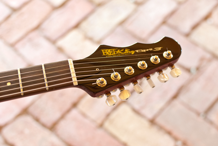 Utólag visszagondolva, szerintem a vásárlás ténye az első pillanatban eldőlt, csak az időpont volt kérdéses, hogy mikor adom a fejem egy újabb próbának. Addig kiműveltem magam a netes irodalom alapján a márkából, és részint megkaptam a válaszokat a fejem felett lebegő kérdőjelre, hogy FRET-KING?!?! Az meg mi? A hangszer Koreában készült (sorozatszáma: B05179, Blue Label), már jópár éve gyártják, és egy bizonyos Trevor Wilkinson (aki alapvetően hardver-t gyárt gitárokhoz, pl.: húrlábak, hangszedők, meg pl. a Vintage márkájú hangszerek, stb...) az elkövetője. A netes videókban kiemeli, hogy sok a gyártói tapasztalat, jó az anyaghasználat, okos a tervezés, stb., de valahol mégiscsak a valóság a lényeg. És a valóság egy nagyon jó, kivitelezésében igényes hangszert mutatott - olyan áron (189.000 Ft, amiben benne volt egy húrkészlet és egy speciális plüss puhatok, külön a formához alakítva), ami a netes listaárhoz képest kifejezetten kedvező volt (listaár: 240.000 Ft, balkezesben 250.000 Ft + szállítás, mivel nincs már magyarországi forgalmazó - sőt a balos típust meg is szüntették 2013. februárjától...). Az igényességet itt szó szerint értem, ugyanis első osztályú Gotoh kulcsokkal érkezett (pont olyanok, mint amilyenek a Desiré-n szolgálnak évek óta), plusz Alpha potméterekkel és kapcsolóval, szintén Gotoh híddal, Fret-King (Wilkinson W90) hangszedőkkel van szerelve. Nem mellesleg a hangszer összes testmarása igényesen ki van fújva fekete grafitfestékkel. Ilyen árnyékolást sem a Sheraton-ban, sem a japán Fenderben nem látni, csak amerikai hangszerekben szokás.