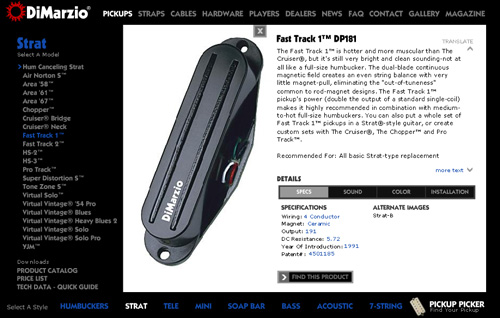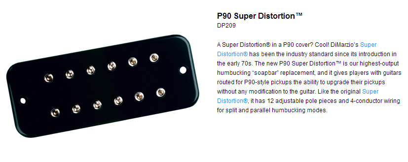 Okulva a korábbi tapasztalatból, mindenképpen olyan hangszedőt kerestem a megmaradt hátsó Wilkinson helyett, aminek több mélye van, nagy jelszintje, és (mire használja az ember a hátsó állást) lehet rajta zúzni. Hát ez éppen egy humbucker definíciója - mily' meglepő. Jött hát a keresés, de nem tartott túl sokáig: a bevált recepten ne változtass alapon a választás DiMarzio lett. DiMarzio-ék az egyébként is elég szűkös piaci P90-es kínálatban is gyártanak több, egymástól jelentősen eltérő típust: P90-es házba szerelt humbuckereket is. Egy ilyen hangszedő választása egyszerűsíti a dolgot: nem kell fúrni-faragni, esztétikailag is egységesebb a küllem, és egy perc alatt bedobható. Régóta kíváncsi voltam (csak nem volt hozzá hangszerem) a nagy legenda Super Distortion-ra, hogy milyen hangja lehet az én kezemben, és bár ez a P90-es nem pont az eredeti Super Distortion, de sok fórumon azt írják, hogy nagyon hasonlóra sikeredett. Hát akkor hajrá: 27.900 Ft, rendelés az Eldorádóból, három hét alatt jött meg, mert külföldről kellett beszerezni - semmi gond, nem volt sürgős.