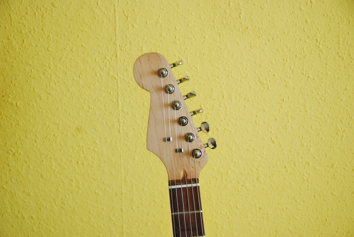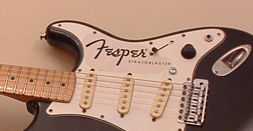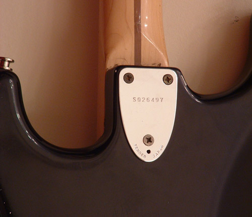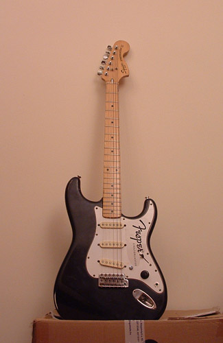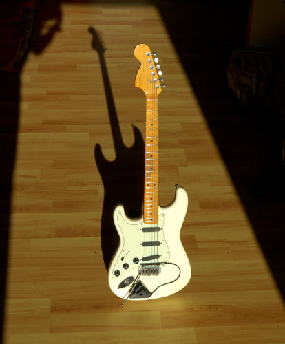 Sima fehér balkezes Stratocaster, japánban készült, 1988-ban. Ezért még nem vettem volna meg, de a bő 170e Ft-os árban benne volt a satus kulcskészlet, a Wilkinson tremoló (jippí!), és egy speckó Seymour Duncan híd-humbucker. És nem mellesleg Németországban volt a hangszer, onnan elég olcsón haza lehetett hozatni. Az előbbi 'sima' jelzőt annyival egészíteném még ki, hogy ez egy 1968 Reissue modell, aminek van egy pár sajátos jellemzője: egyrészt a nagy vintage fejforma, a 21 bundos (aki anno kitalálta a 21 bundos nyakat, meg kéne büntetni) jávor nyak, és a hangszedők felől állítható nyakpálca. A fogólap lakkozott jávor, és a merevítőpálcát ennél a modellnél elölről teszik a nyakba, így hátul a gitár nyakán nincsen a jól ismert 'skunkstripe'. A test anyaga a szokásos éger, a húrokat hátulról lehet befűzni.