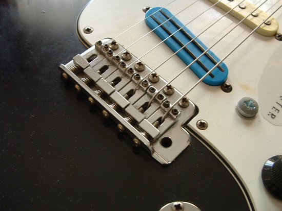 Innentől a szerelés része végülis megvolt, már csak össze kellett kötni a dolgokat. A gitár hangszedőinek mágneses jele ugyebár mono nagyjack kábelen van kivezetve eredetileg, a GK-2-be viszont kisjack bemenettel kell érkeznie. Mivel ez a patch kábel valahol eltűnt az idők viharában, így hát csináltam egyet. Innentől végülis már csak össze kellett dugni a VG-88-cal, és beállítani a pickup jelszintjét. Ezt a részét a dolognak már azt hiszem, inkább a VG-88-nál írom majd le, mert innentől végülis az alkalmazott gitártól független a hangzás --- és ez a kemény. Visszatérve szegény Squier-re: elkezdtem a módosítások hatására használni. Kapott egy hajgumit a nyak végére, ami akkor nagy segítség, ha épp slappelni támad kedvem. Aztán a hosszabb szarvban levő - balkezes használatban nyilván felesleges - hevederakasztót is kivettem, mert gyors mozdulatoknál útban volt. Végezetül pedig tettem vele egy kört a magyarországi Fender képviseletben, hogy mégiscsak megcsináltassam a tremolót. Hát ők annyira alulmotiváltak voltak a témával kapcsolatban, hogy asszem oda sem kell többet visszamennem... (A cégről elég annyit mondani, hogy a Fender bemutatóteremben nem volt egyáltalán Made In USA gitár, csak ilyen daráltfa mexikói-távolkeleti hulladékok... Ez ám a bemutatóterem! - na mindegy.) A Vintage'52, mint jól bevált szerviz következett ezután, de ott nem volt raktáron beépíthető tremolókar. Azt mondja a Tivadar, hogy nézzem meg az Oroszlánbarlangban - mondom oké. Hát ez annyira jól sikerült, hogy az ottani hangszerész által került beépítésre egy Schaller tremolókar. Természetesen az eredeti helyére, tehát jobbkezesen. Gondoltam megpróbálom így fordítva, aztán ha nagyon megszokhatatlan, akkor majd veszek teljes balkezes tremolót. A Schaller tremolója természetesen nem Fender, úgyhogy egy kis darabot ki kellett vágni a húrláb tőkéjéből, oda került egy persely, meg a szorítógyűrűvel rögzíthető tremolókar. Elhoztam, elkezdtem használni, és talán megszokni is. Még egy-két rugó kelleni fog, az már most látszik, mert gyengébb mozdulatra is elég nagyot húz még, de ez nyilván csak múló állapot :), amúgy teljesen jól szól: nem Bigsby-s, hanem Fenderes, de jó lesz az.