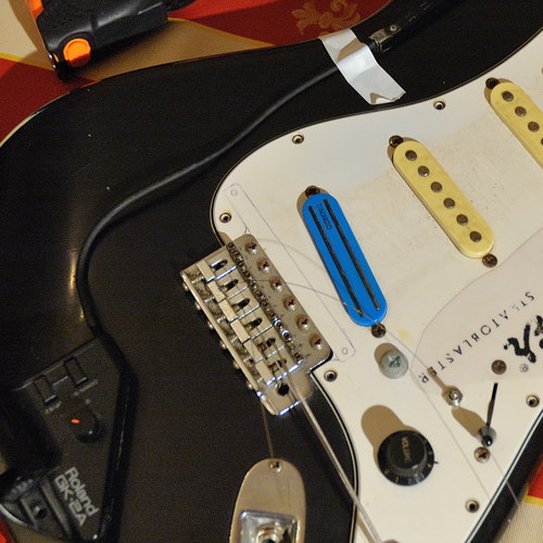 Persze nekem ez nem elég. Eltelt egy-két eseménytelen év a gitárt illetően, aztán 2009 őszén megbolydult az élet: Történt ugyanis, hogy hirtelen felindulásból sikerült vennem egy Roland VG-88 típusú gitáreffektet. Aki nem ismeri, annak írok úgyis még a készülékről, a Squier szempontjából annyi fontos csak, hogy a hexa hangszedőt a Squier-re szereltem rá. Persze nem volt ez annyira egyszerű történet, mint azt a használati útmutatókban írják... :) A lényeg, hogy ezt a hangszedőt a híd felőli pickup és a híd közé kell beépíteni a hídhoz lehetőleg a legközelebb, mégpedig úgy, hogy a húroktól ~1 mm távolságban legyenek a hangszedő pólusai. Na, ez az én esetemben olyan jól alakult, hogy a hangszedő be sem fért a húrok alá, olyan alacsonyra van állítva az akció --- hiába no, a japán minőség... :) Szóval ki kellett vágni a koptatólapból a hangszedőnek megfelelő méretű részt, és közvetlenül a testre rögzíteni a hangszedőt. Persze ez kisebb odafigyeléssel (meg a már megszerzett rutinnal :)) házilag is megoldható, és szerencsére a GK-2-höz mellékelt csavarokkal + rugókkal pontosan be lehet állítani a magasságot. Ezek után az adapter következett, ami már nem okozott túl sok gondot: csak a hevederakasztó gomb csavarját kellett kicsivel hosszabbra cserélnem, hogy stabilan fogjon, amúgy teljes mértékben oldható és non-destruktív csavarkötéssel lehet feltenni az elektronikát.