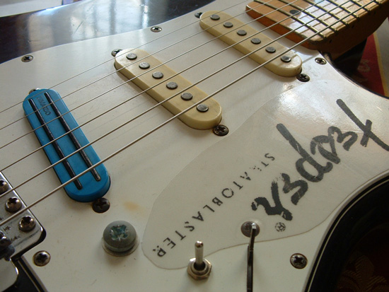 Na ez már valami. A 89-es EMG egy szintén AlNiCo magos hangszedő, totál zajmentes, nagyjelű, hátul elég visítós hanggal. Úgy köttettem az elektronikát, hogy az egyik Tone poti együtt szabályozza a középső és a hátsó hangszedők hangszínét, így vissza tudtam venni a magasokból, ha akartam. De nem volt rá feltétlen szükség, ha az ember az overdrive-ot jól állította be. Így aztán lett nagyon szép nyaki single coil hangom, disznó hátsó bridge a torzításhoz --- mi kell még? Ebben a verzióban kifejezetten tetszett a hangszer hangja, úgyhogy sokáig így használtam.