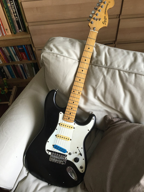 Az Ibanez után - ahogy már írtam is - az Epiphone következett. Ez a gitár jól bevált, két dolog miatt döntöttem úgy, hogy kell neki egy kistesó is: az egyik, hogy ha koncerten szakad egy húr, legyen cseregitárom (ez volt a kevésbé fontos szempont, mert ma már egy húrcserét hangolással a profi gitártechnikusokat megszégyenítő idő alatt vagyok képes megcsinálni ;)), a másik pedig, hogy a P.O. akkoriban eléggé kétlaki volt (Ete, BP), és minden héten nem akartam cipelni a gitáromat oda-vissza. Sok pénzt nem akartam rá áldozni, de azért jó gitárt szerettem volna. Eddigre már elmúlt a 'csak-balkezes-gitáron-jó-játszani' hozzáállásom is, így simán jobbkezeseket is nézegettem. Ekkor jutott eszembe, hogy az etei próbateremben régóta ott porosodik valami Aria Pro-II tokos gitár. Nem is nagyon tudtam, hogy mi lehet az, mondom, azt tuti nem használja senki. Amikor jobban megnéztem, láttam, hogy egy Squier, de gyanús lett a dolog, mert Fender húrlába, mert hangolókulcsai voltak. Lefirkantottam hát a szériaszámot, aztán utánajártam a dolognak. Kiderült, hogy ez egy SQ-szériás, 1983-as japán gyártányú Squier, amit akkoriban kábé a 'Japán Fender-nek' hívtak, mivel a Japán Fender-eket akkoriban csak exportra gyártották, Japánban nem kerültek eladásra. Arra ott volt a Squier. Így aztán az SQ és JV széria effektíve japán Fender minőséget képviselt. Aztán eltelt laza húsz év, a Squier, mint márka lassan egyet kezdett jelenteni a 'ne-vedd-meg' kategóriával, és ez olyan szinten beépült a köztudatba, hogy kemény 30e Ft-ért tettem szert végül a gitárra (Köszi Csabik az utánajárást!). Amikor utána nem sokkal elvittem egy hangszerboltba egy általános átnézésre, kapásból 140e-t ajánlottak érte, de láttam már többért is kirakva tökugyanilyen gitárt.