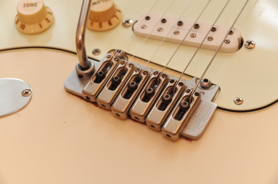 A hangszerboltban csak egy gyors próbára volt lehetőség: stabil, pontos, jól van beállítva, működik - mondom oké, a hangját majd otthon meghallgatom. Természetesen így is történt nem sokkal később, először beállítottam a kart egy kényelmesnek tűnő pozícióba (a kar hossza, szöge ennél a tremolónál állítható, és csavarokkal rögzíthető - ez nagyon jó dolog), gyors hangolás, erősítőbe bedug, aztán hadd szóljon. Összességében nagyon meglepődtem, mert olyat tapasztaltam, amire nem nagyon számítottam. Már a Desiré-nél is leírtam, hogy a Bigsby miatt megnőtt a hangkitartás, és ez ezúttal is így történt - ennek oka gondolom a nagyobb tömeg és a másmilyen erőátviteli rendszer; ez idáig rendben is van. Viszont ami váratlanul ért, hogy a gitár hangja szellősebb, levegősebb lett, és elkezdett egy kicsit hasonlítani a félüreges testű hangszerek hangjára. Nem nagyon tudom megfogalmazni, hogy mit is jelent ez, mivel természetesen üregek nem kerültek a hangszerbe, viszont a rezonanciája ilyen irányban változott. Talán az lehet ennek hátterében, hogy a rezgéseket a húrok hátrébb, a test végéhez közelebb is adnak át, és így egy 'virtuálisan hosszabb hullám' jön létre, mivel hátrébbről jön a testre ható gerjesztés; kicsit úgy, mint a jazz-gitárok lebegő hídjainál. Az biztos, hogy a Bigsby-féle erőátvitelhez kifejezetten hasonló, ízes harmonikusokban gazdag hang kerekedett ki a hangszerből, ami eddig is benne volt ugyan, de nem volt ennyire jelen. Már fél órája csodálgattam ezt, amikor rájöttem, hogy a tremolót valójában még ki sem próbáltam :). Persze abban sem kellett csalódni, nagyon szépen, finoman jár, éppen ugyanúgy viselkedik, mint egy Bigsby: nagyon minimális (fél hang a maximum) hangmagasság-változtatásokra jó, de nekem ez több, mint elég. És még úgy is nagyon jól tartja a hangolás, hogy a Fret-King-en hagyományos híd van, nem görgős. Nézegettem, hogy vajon meddig fogja bírni, mivel szemmel is látható igénybevételt kap - majd az idő eldönti.